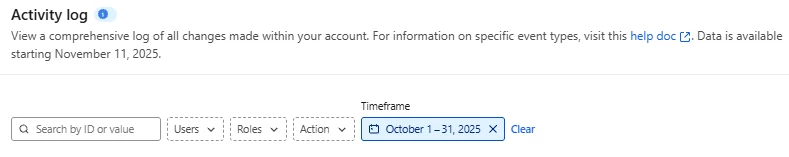The images below shows the activity log issue. It says “Data is available starting November 11, 2025.”