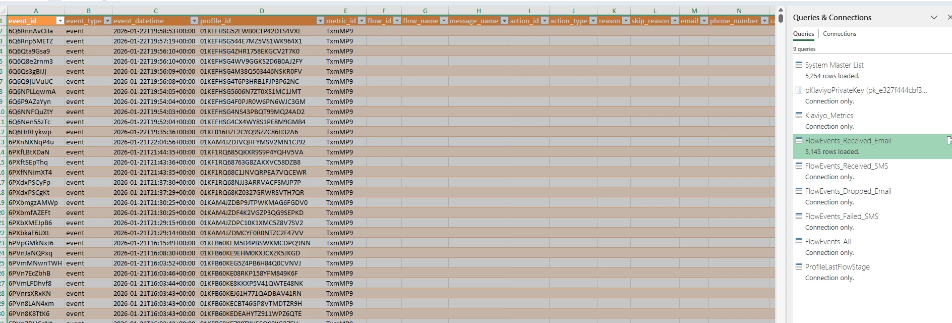 We built a Power Query in Excel using the proper metric_IDs (i.e. filter = "equals(metric_id,'XXXXXX')" // Dropped Email), the columns are created but the values are null. A quick trip to ChatGPT and we were told that Klaviyo has three different metric levels and the ones we need aren’t available. Which raised another question, why publish a metric list if they are available for use?