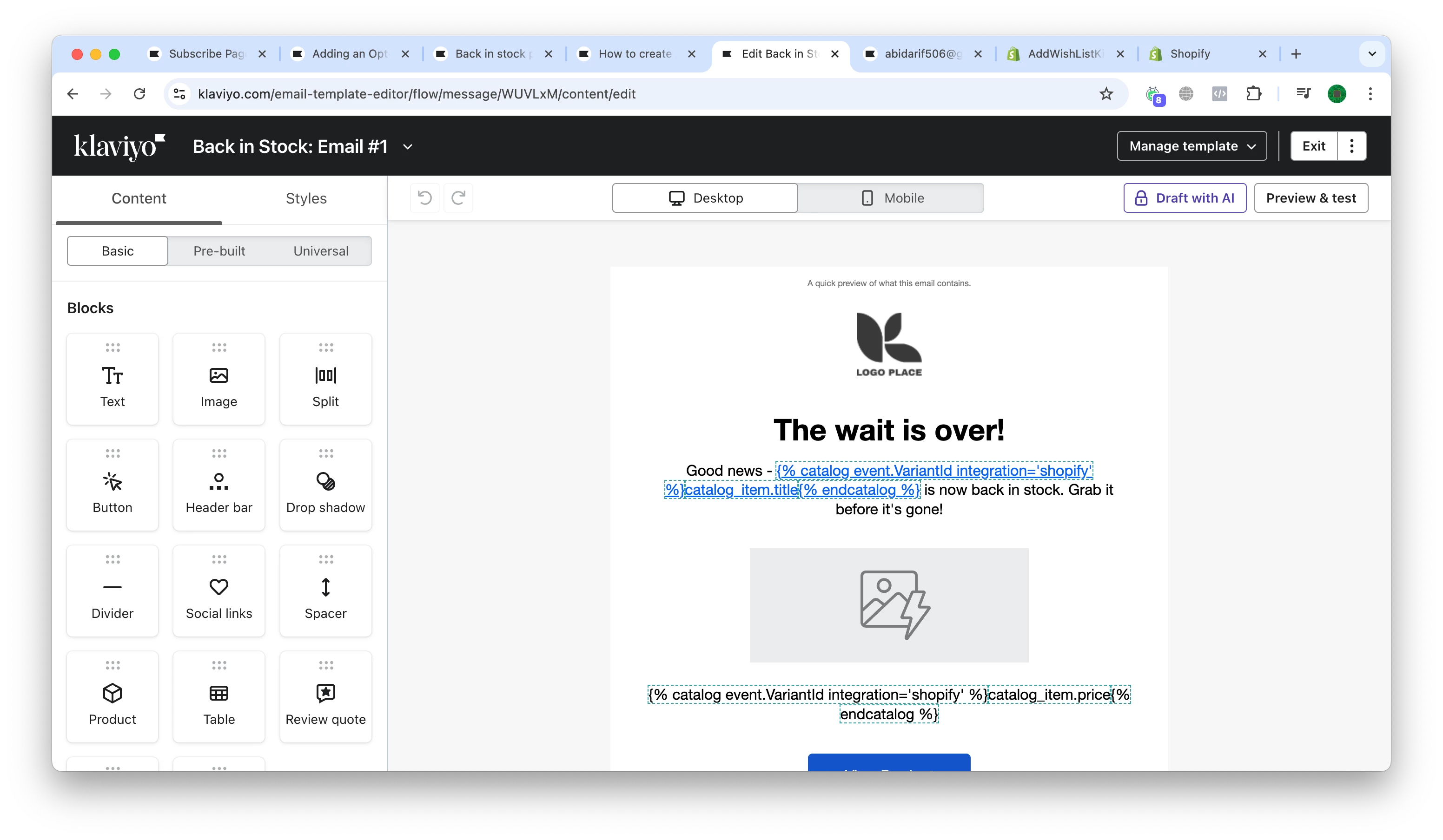 I want to setup Klaviyo with Shopify ( prestige theme ). I already had the back in stock flow active, ( i deactivated it) because the problem is that we have a multi language store. I want to have the back in stock popup in English, German and Dutch language) for our .com .com/de and .com/en. So i want to be able to translate the popup