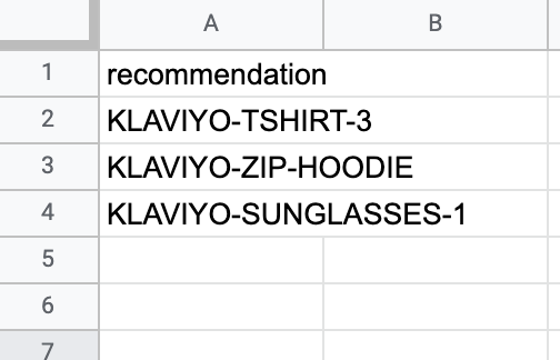 Each row after the ‘recommendation’ header will contain the Product ID of the product you wish to recommend. This Product ID needs to match the Product ID of the product within the Klaviyo catalog.