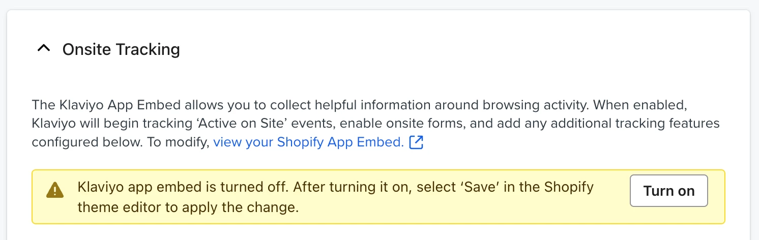 To start, you won’t need to turn on the app embed when you’re using a headless setup. Reason being that you’re already manually installing our onsite javascript and tracking events. The app embed doesn’t work as expected on headless Shopify stores, so no need to turn it on.