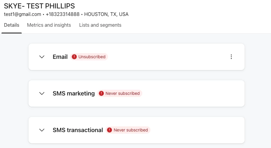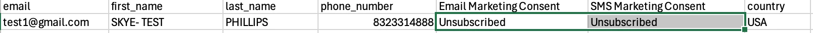 When this file is loaded, SMS marketing consent is ‘Never subscribed’ instead of ‘Unsubscribed’. Meanwhile, Email correctly reflects the status ‘Unsubscribed’ as entered in the CSV file.