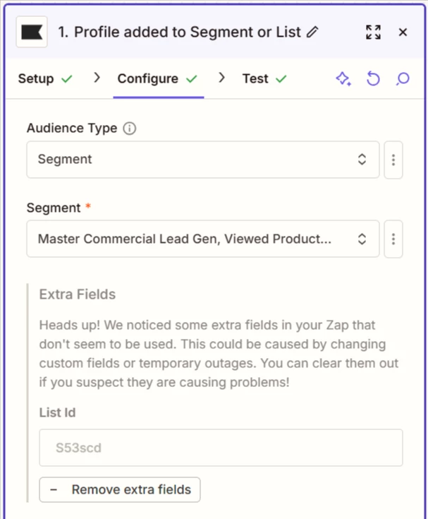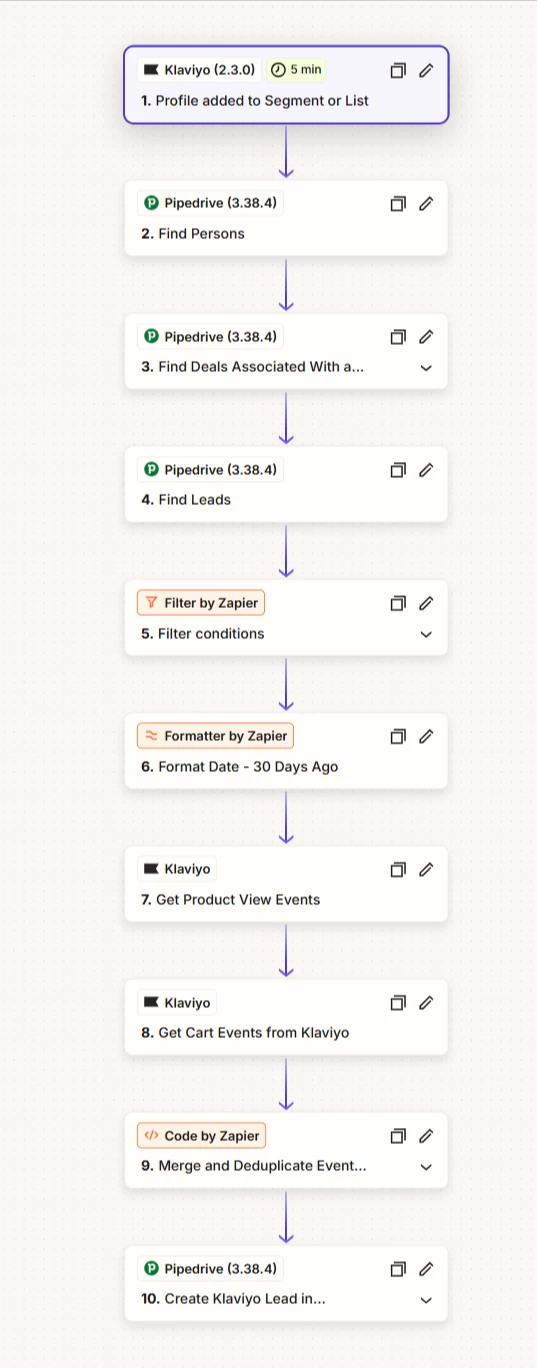 I am trying to transition my python script to Zapier. We use the script to pull customer, product views, and products in cart and create a lead for our commercial sales team. We were creating new Asana tasks but have transitioned over to PipeDrive. The designed the zap to pull new profiles from a lead gen segment. I cross check PipeDrive for the person. If we have no record of the person, it creates the record. I then pull product view and cart events which are merged together to create a list. The final step is to create a lead and add a note in Pipedrive for our Commercial Sales team.