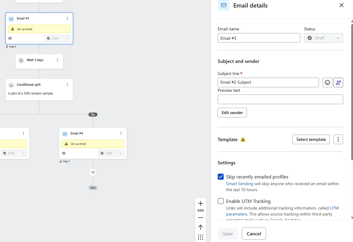 Great question, and thankfully a simple answer to this one. The Klaviyo flow builder won’t let you add an A/B test until you’ve set up the actual template.