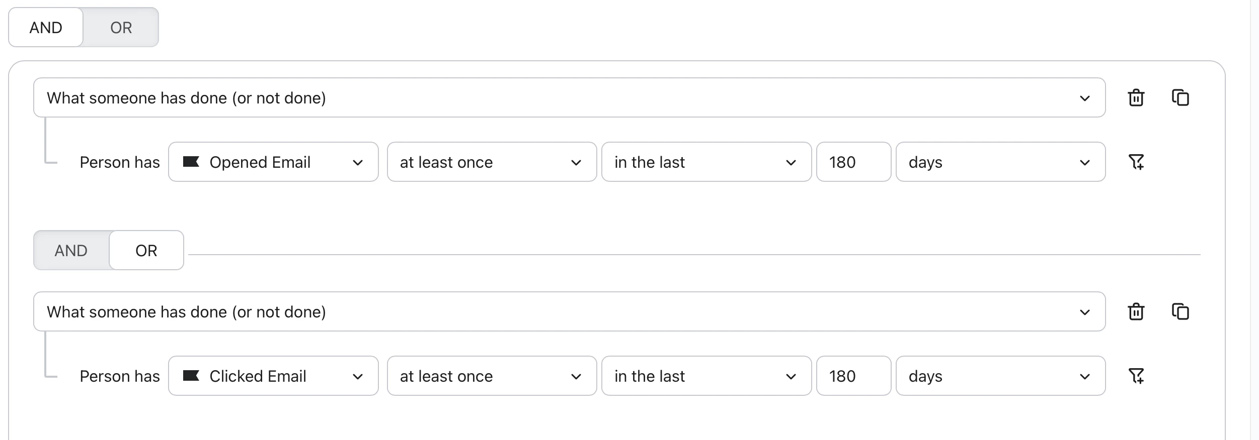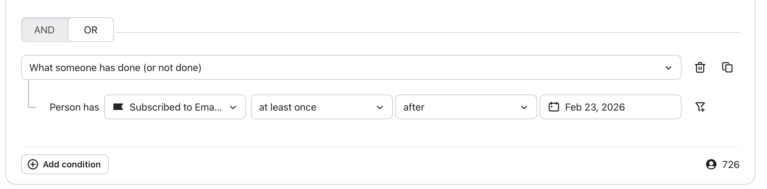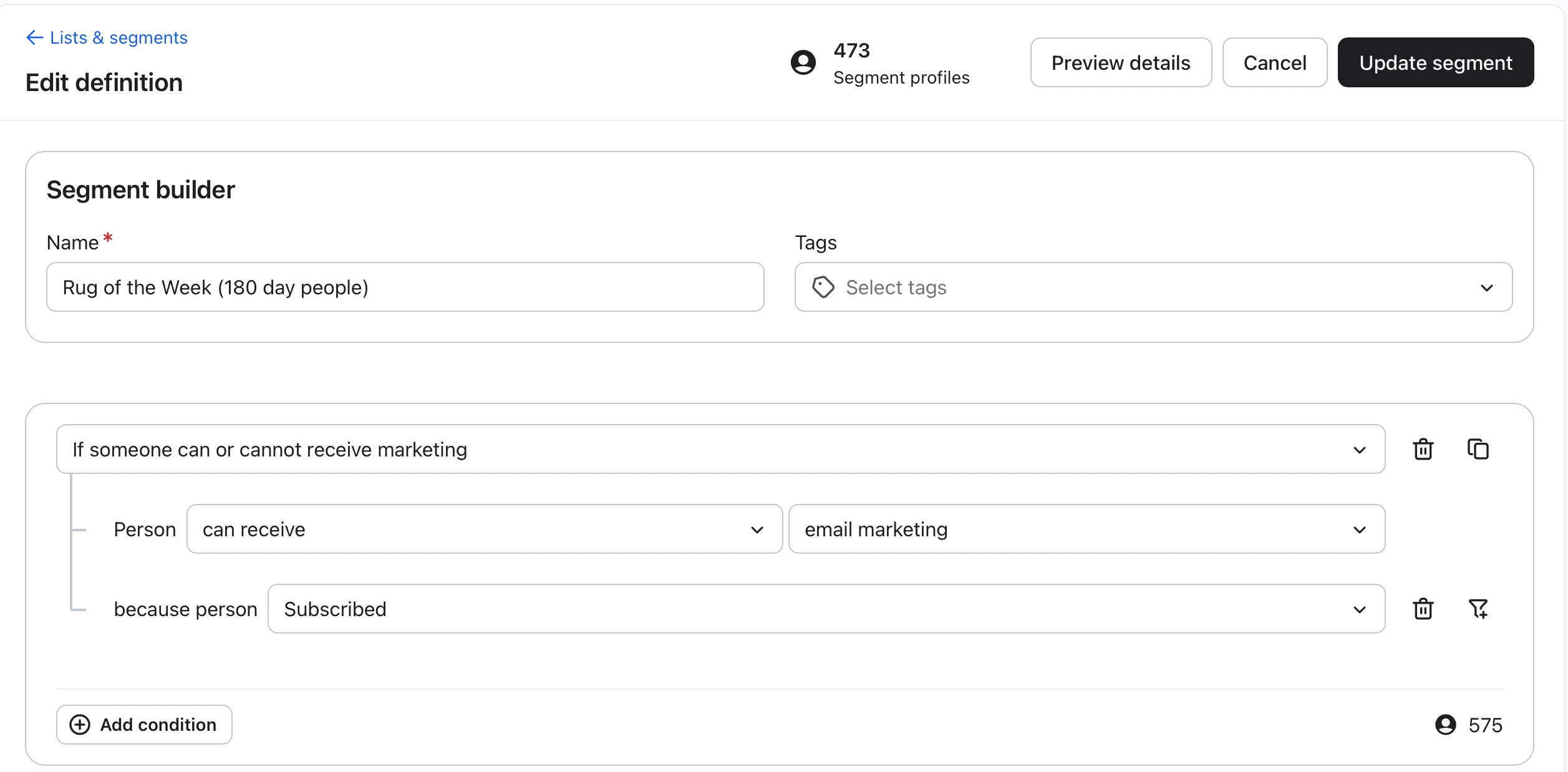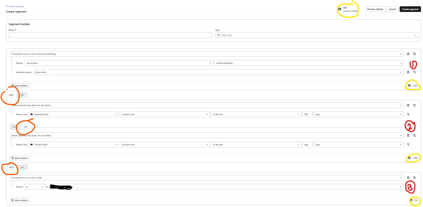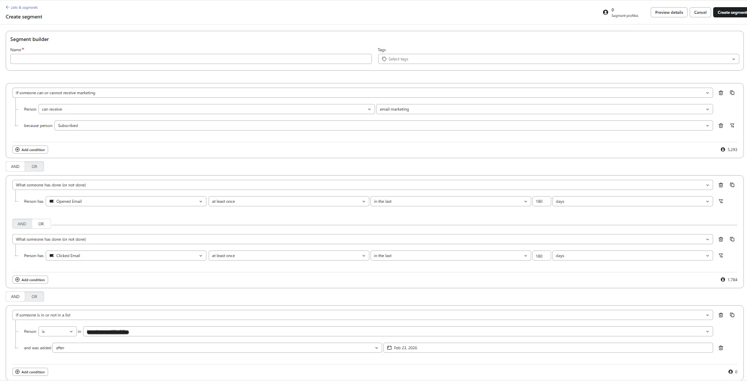 i want to send an email to people that are able to receive marketing because they subscribed and have either opened or clicked on an email in the last 180 days but i also want to include new people that have subscribed since 23 february 2026.