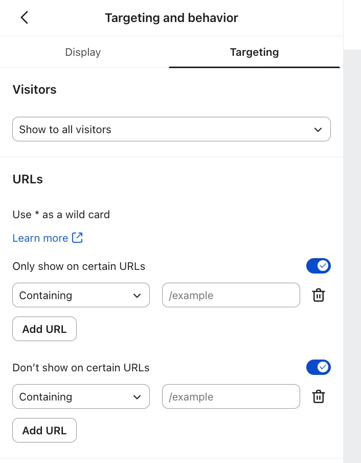 With embedded forms, you have more freedom to add them where you like, since you manually paste the embed code onto your site. If your storefronts each have their own url, you can utilize the “Only show on certain URLs” toggle in the form’s targeting settings. For example, you can use this setting to only show a certain embed form on pages that contain .co.uk in their URLs.