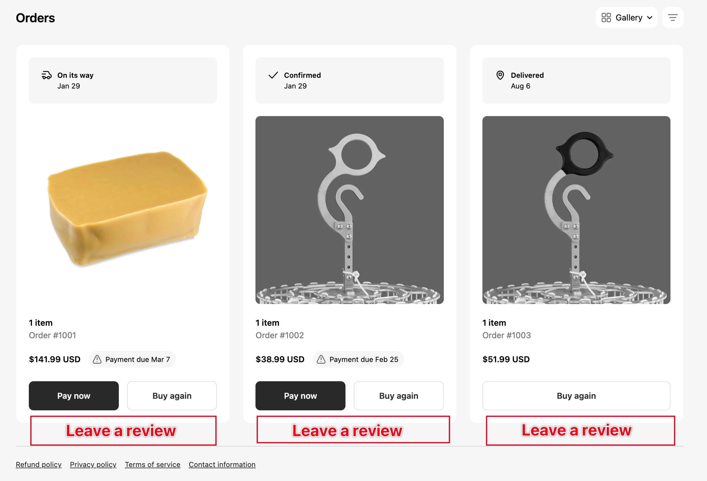 then per product item, a button with link like below would direct to the product page where you can review the item in question: