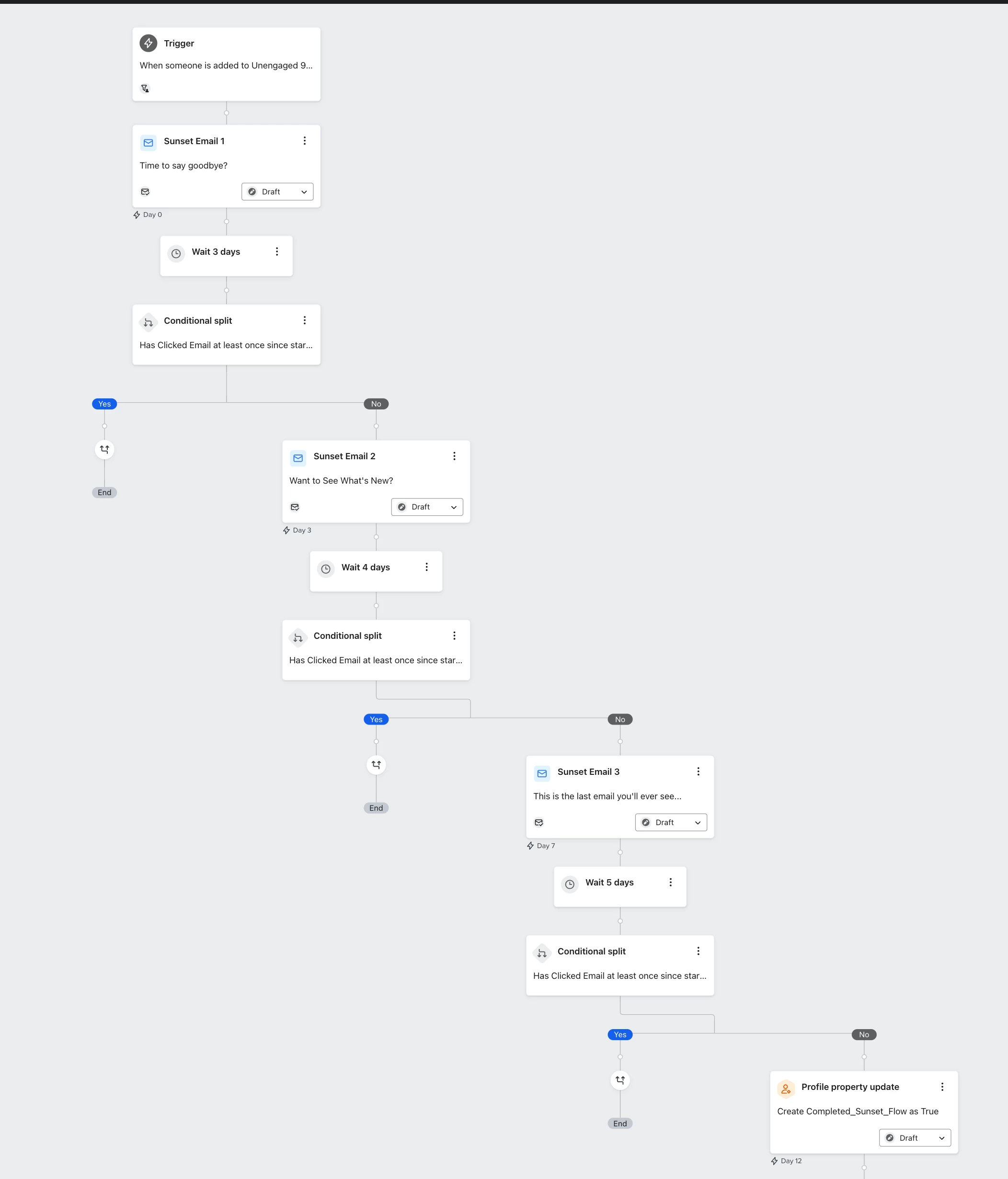 I’m new to flows, and am setting up a sunset flow for our customers. I want to send them a few emails once they’ve been marked as “unengaged for 90 days”… to give them a few chances to re-engage. After each email, I want a time delay to give them a chance to click an email… before moving to the next email in the sunset flow.