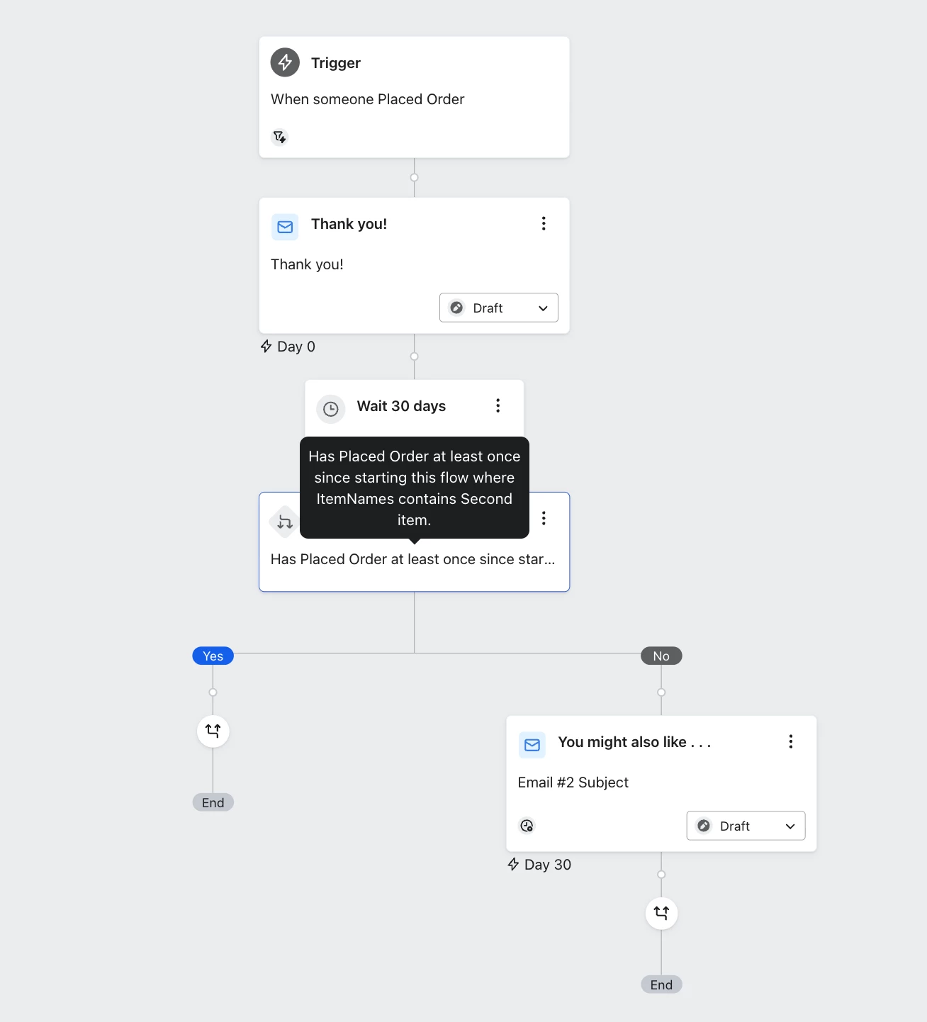 If the customer has not bought Upgrade A-1, Klaviyo sends them an email.