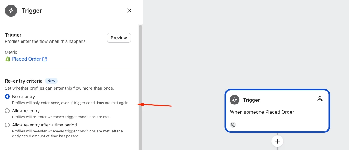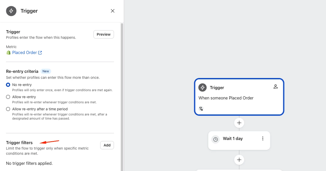 One more thing worth mentioning: if you only want profiles to enter this flow when they purchase a specific product, use a Trigger Filter rather than a flow filter. The trigger filter checks the properties inside the Placed Order event that fired the flow, so it will validate whether that specific product was actually part of the order that triggered entry. A flow filter won't do this job the same way since it checks profile-level conditions, not the triggering event itself.