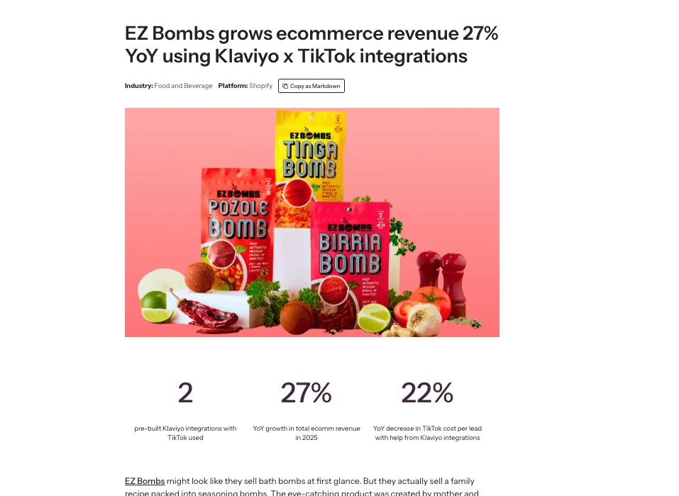 For those who missed the Fireside Chat back in November of 2025, I interviewed Ben Amaya who is the marketing director from EZ Bombs, a social media viral spice seasoning bomb CPG. Weeell, since then, they actually have been working with Klaviyo on amplifying their success story through a collab on a case study all about how they have leveraged the Klaviyo TikTok Audiences integration and TikTok Lead Ads integrationto drive ecommerce revenue!
