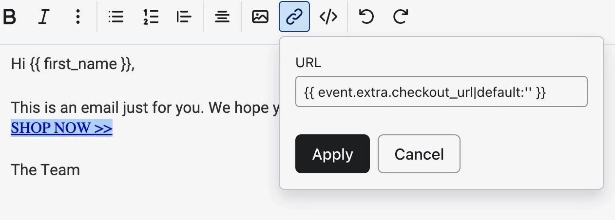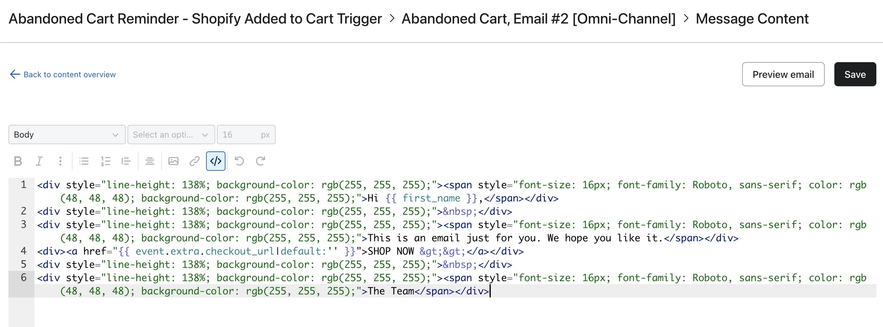 I’m working on Abandoned Cart, Email #2 [Omni-Channel] and trying to create a SHOP NOW >> button that dynamically links to each recipient’s individual shopping cart.