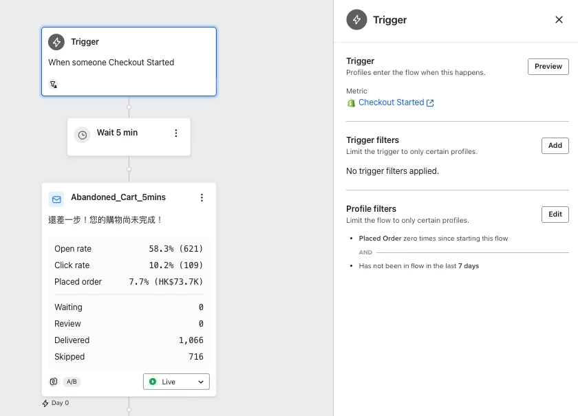 We’ve set up an Abandoned Cart Reminder (Email) auto-flow in Klaviyo, using the trigger “When someone checkout started” to send reminder emails to customers who have abandoned their carts.