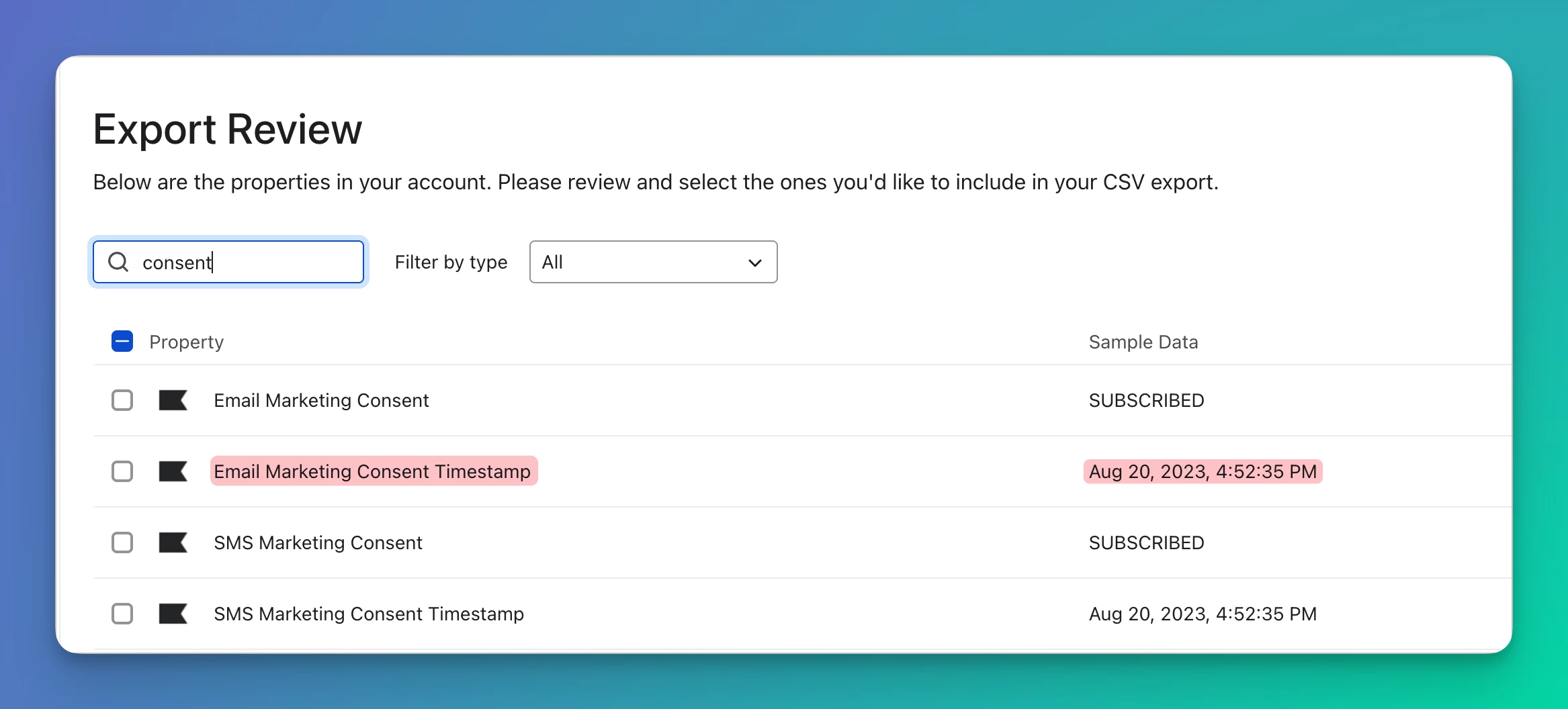 That should pull all the emails that have consented, then you can export that Segment with the selected fields that shows the timestamp of when they consented.
