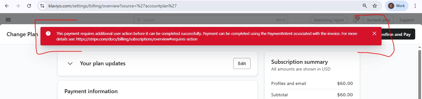 Update: I got an additional message on the Klaviyo billing page as follows: