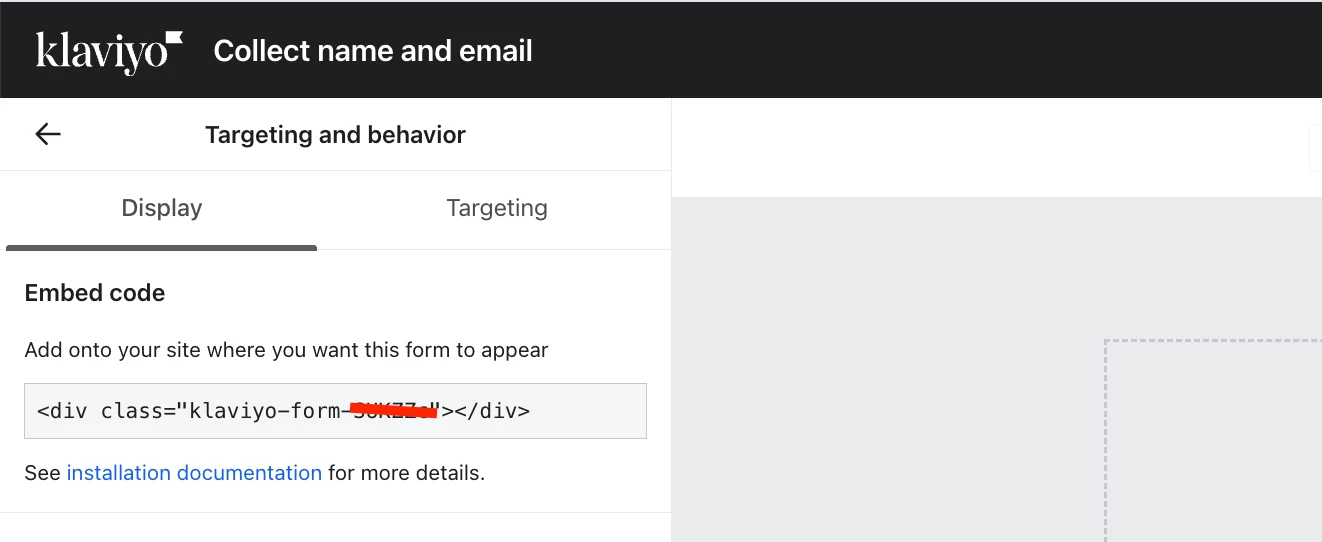 When you log ind to Klaviyo - on your left handside you can access your forms via. the “Signup Forms”-tab. Then click the form in question and and hit “Targeting and Behaviour”. In there you can see the div code for the form ad shown below. This snippets can then be inserted into your shopify page via the custom liquid in the theme.