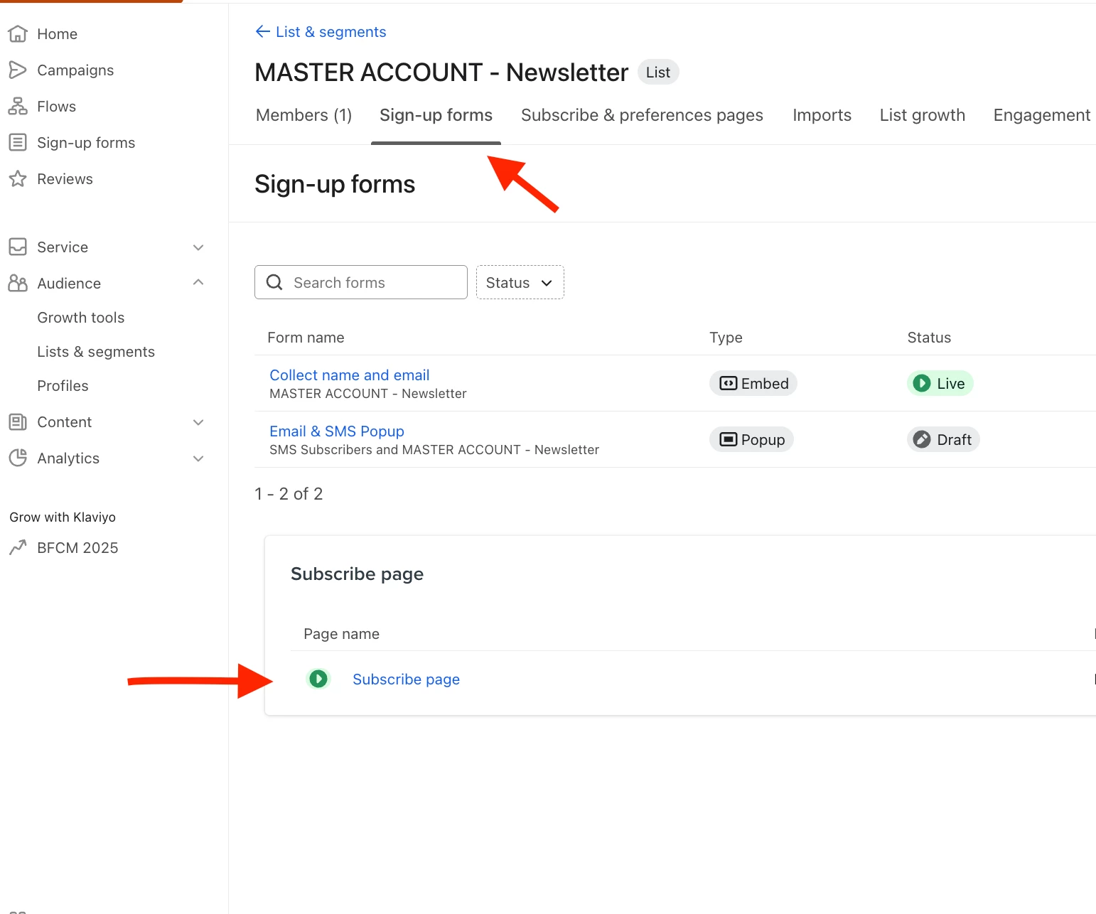 Head to your list and click it → Then click “Subscribe & Preference pages” → Then edit the subscribe page for the list → Once you are happy with the page, click the “Signup forms” in the list tab → Click Subscribe pages and then you will find a shareable link enabling people to sign up to your list directly. I’ve shared a few screendumps below and you can access the full guide here: https://help.klaviyo.com/hc/en-us/articles/115005078547