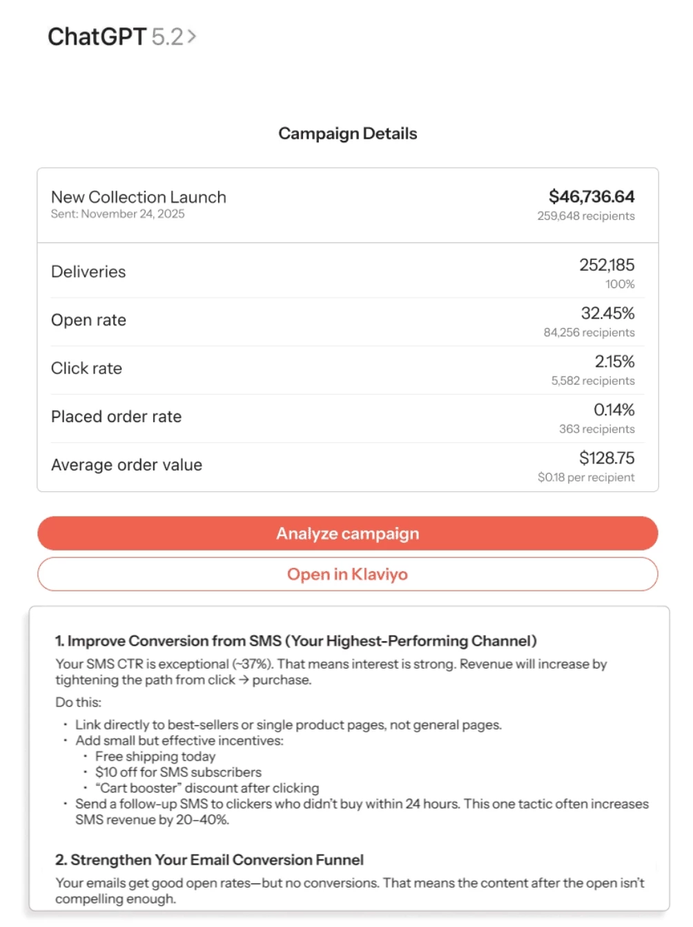 The Klaviyo app for ChatGPT is great for quick answers, analysis, and content creation that are grounded in your live Klaviyo data.