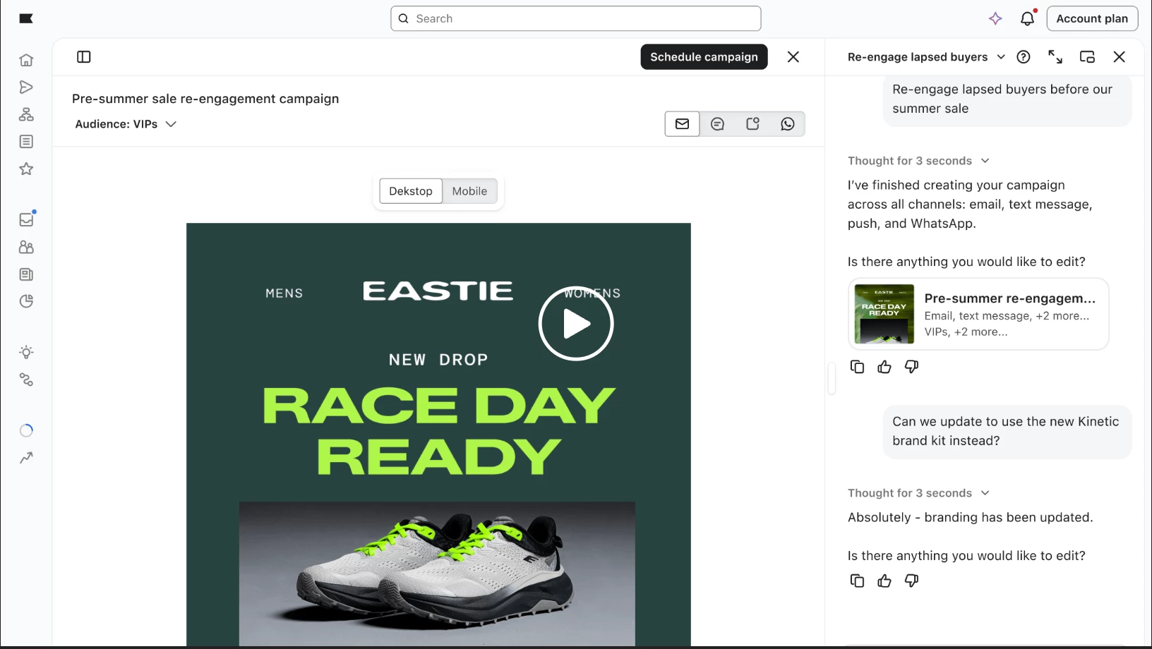 - What changed: You can now send RCS messages alongside your email and SMS campaigns.