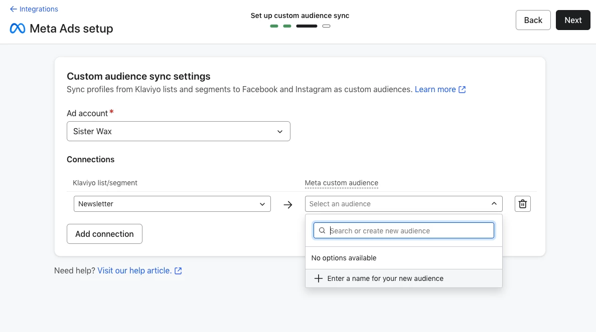 This issue can happen if the custom audience you created isn’t on of several custom audience types we allow. Klaviyo can connect to custom audiences with the sub-types: