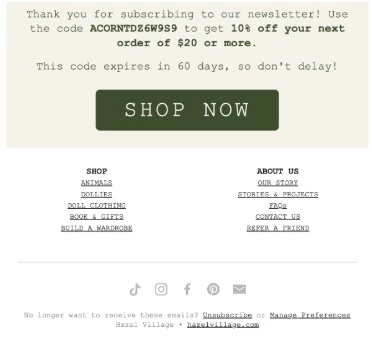 Keep body text to 2-3 sentences. Since Hazel Village has an old-timey feel, we use Courier New for all our emails. All web-safe fonts are legible, so pick whichever fits your brand.