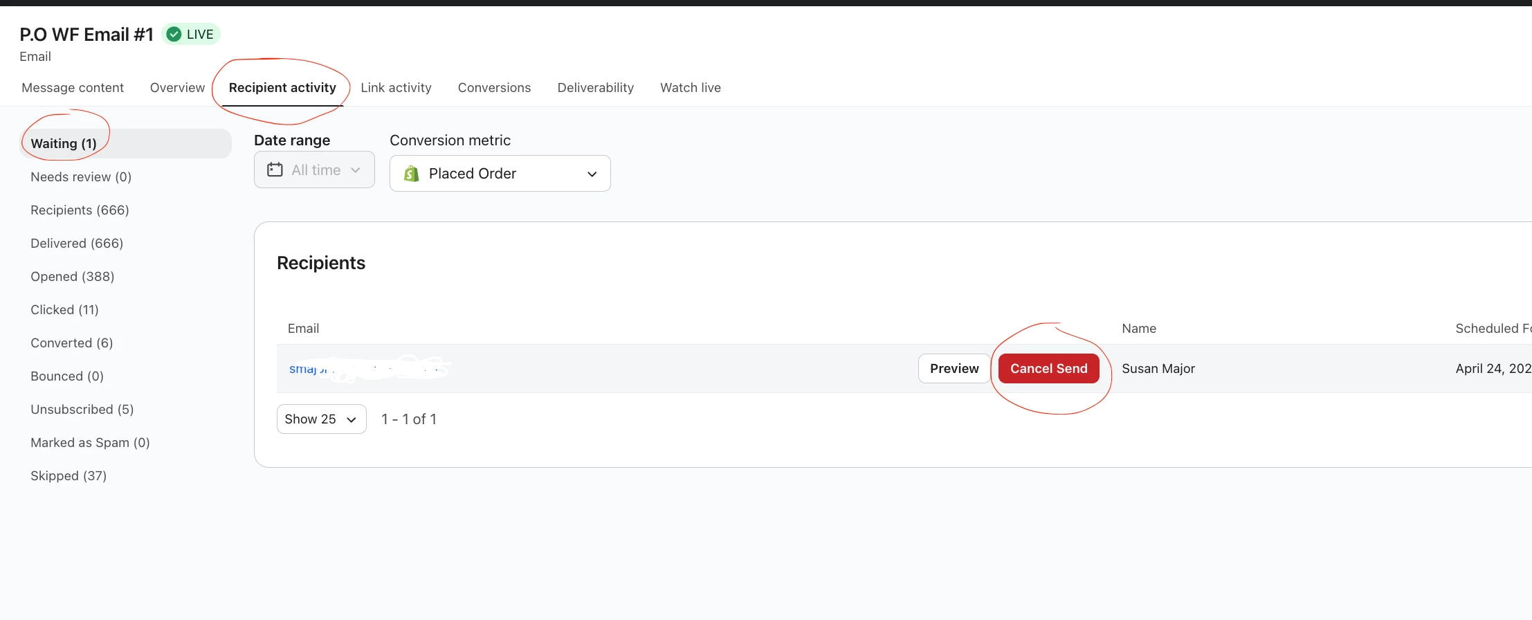 3. Open the “View Details”→ Recipient Activity → Waiting and you should spot their names on there, hover over and it will show “preview” or “cancel send”. You would just cancel send.