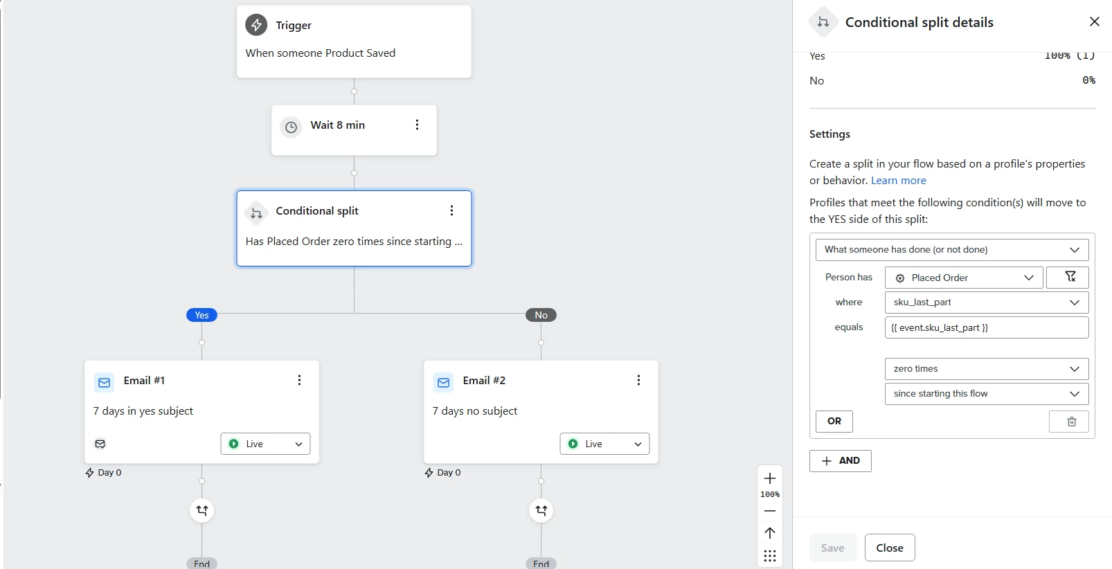 If a customer saves a product (Product Saved event) and does not place an order (Placed Order event) with the same sku_last_part within 7 days, they should get a reminder email.