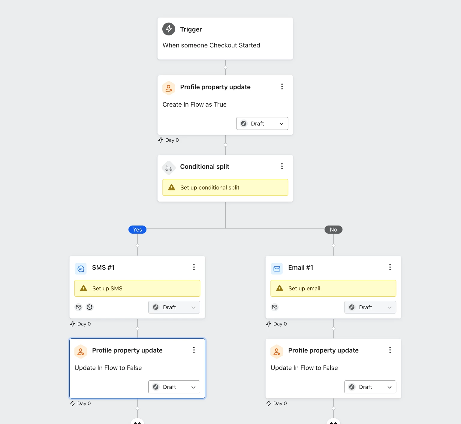 To do this, add a profile property update action to the top of a flow. Create a new property, and make it something like, “Create In Flow as True.” After that, add another profile property update action right above every exit of the flow. This should update an existing property, and be set to “Update In Flow as False.” You’d want to do this for each flow you have.